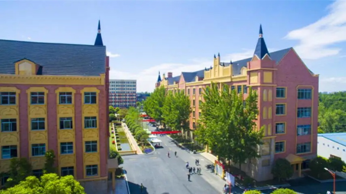 校園內綠樹成蔭、繁花盛開、假山池沼、亭臺樓閣、小橋流水、林蔭小道,景色宜人。